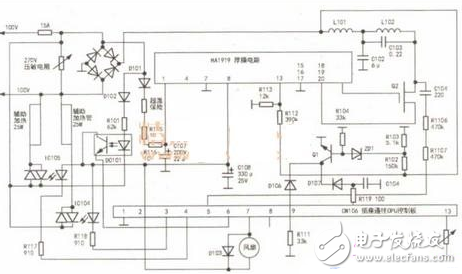 从图中能够看得出它是1个类似电磁机原理用高频加热套锅的电饭煲,电压经桥式整流器后由L101、C102过滤给加温电磁线圈L102和C103构成的串联谐振控制回路及其电源开关管供电系统。RA1919是一块儿厚膜电源电路,电压由D101整流器经R115、R116、C107过滤给厚膜电源电路內部电源变压器供电系统,C108是电源变压器底压輸出滤波电容,C104、R106、R107是电源开关管D极工作电压抽样电源电路,R102和R103是电压整流器后的交流电压取样电阻,工作电压假如过低ZD101截至,Q1也截至,CPU获得工作电压过低数据信号终止工作中。IC104和IC105是2个光耦双向可控硅(不可以用一般光藕替代),操纵2个輔助电加热器,1个是顶盖电加热器,1个是隔热保温电加热器。D102、R101和光耦DC101构成交流电流过零检验电源电路,检验数据信号根据CN106线排送CPU、D是功率管和桥堆的冷却风扇,由CPU操纵其工作态度。TH101是功率管温度感应器。CN101是套锅过热商业保险高压熔断器,套锅过热时融断,线路板丧失开关电源终止工作中,要更换能够再次工作中。